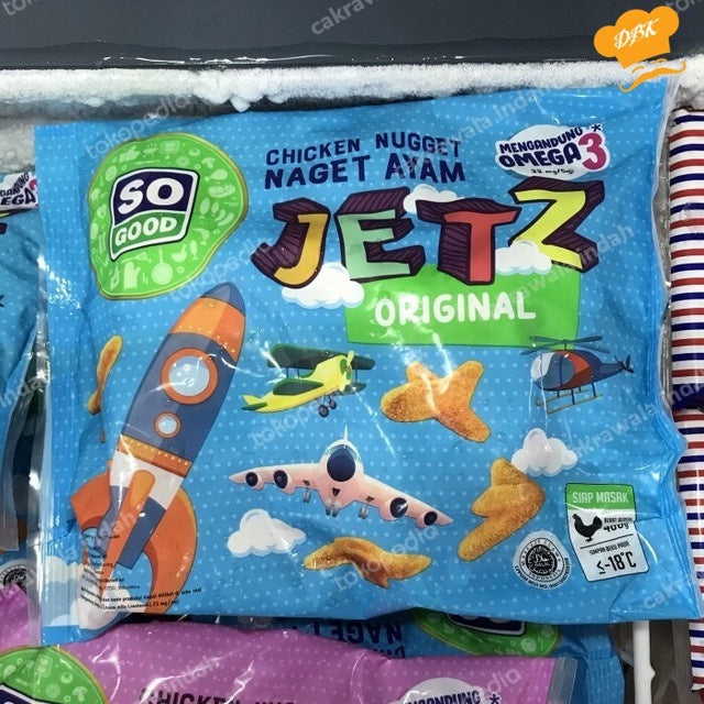 .So Good Chicken Nugget JETZ sajian nikmat penggugah selera , diolah dari daging dada ayam pilihan, dan dibalut breadcrumb yang renyah. So Good Chicken Nugget JETZ hidangan kaya protein dengan rasa original yang disukai anak-anak, dengan beragam bentuk pesawat terbang akan memberikan banyak inspirasi kreatif bagi anak saat makan, cocok sebagai camilan dan lauk bagi anak tercinta. So Good Chicken Nugget Jetz diperkaya Omega-3 baik untuk perkembangan otak anak.